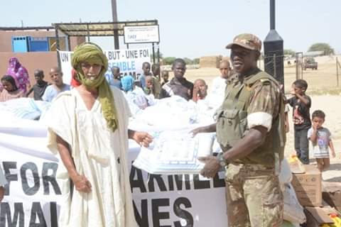 Dans le cadre de renforcement de la cohésion sociale et de l’assistance aux populations déplacées, le commandement militaire de la 5ème région militaire, à travers sa cellule d’action sociale, a offert le vendredi 04 octobre 2019 des vivres et des matériels didactiques aux déplacés de la commune de Nebkit, à 20 km de Tombouctou sur la route Goundam.