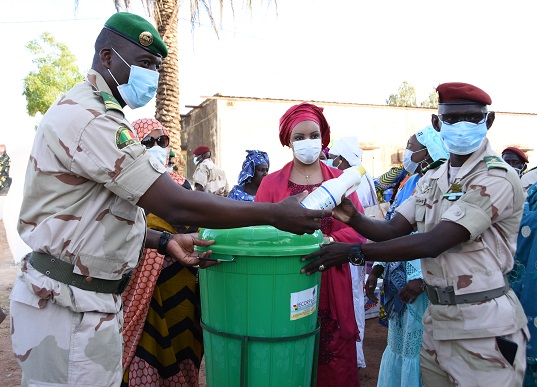 La marraine des Associations des Femmes des Camps du Mali, Mme Diawara Nabou Diawara a fait une série de don de kits sanitaires aux forces de Défense et de Sécurité. C’était le samedi 4 avril 2020. Il s’agit respectivement des camps de Garde de N’ Tomikorobougou, du Régiment Para et du Groupement Mobile de Sécurité (GMS). Ces kits étaient au nombre de 205 composés de 102 cartons de savons, des cartons d’eau de javel et de seaux d’eau. Cette initiative de Mme Diawara Nabou s’inscrit dans le cadre du renforcement des mesures barrières de prévention contre le COVID-19 dans les casernes.