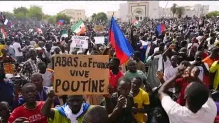 piétinée sur le goudron et remplacée par des drapeaux russes et nigérien.