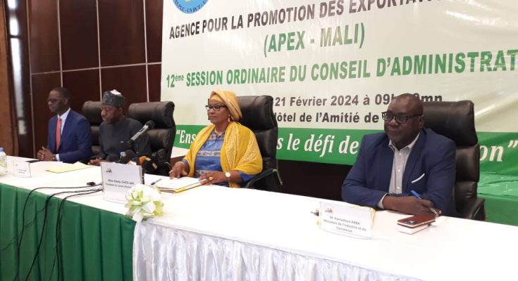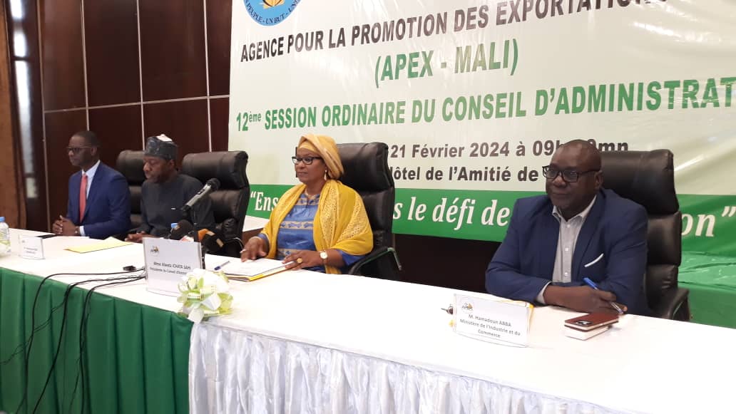 Les travaux de la 12 ème Session ordinaire du Conseil d’Administration de l’Agence pour la Promotion des Exportations du Mali ont eu lieu, ce mercredi 21 février 2024 à l’hôtel de l’amitié. Cette cérémonie a été présidée par Mme Alwata Ichata SAHI, Présidente du Conseil d’Administration, en présence de M . Hamadoun ABBA, ministre de l’Industrie et du Commerce, de M. Massoudou Cissé, Directeur général de l’APEX-Mali et de nombreux participants.