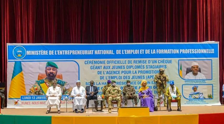 Le Centre International de Conférence de Bamako (CICB) a accueilli, ce lundi 13 janvier 2025, la cérémonie officielle de remise d’un chèque géant d’un montant de 1 130 867 423 francs CFA aux jeunes diplômés stagiaires du 13 ᵉ contingent de l’Agence pour l’Emploi des Jeunes (APEJ). L’événement, placé sous la présidence du Général d’Armée Assimi GOÏTA, Président de la Transition et Chef de l’État, a rassemblé les plus hautes autorités du pays, notamment le Premier ministre, le Président du Conseil National de Transition (CNT), des Présidents d’institutions, des membres du Gouvernement ainsi que des représentants diplomatiques accrédités au Mali.